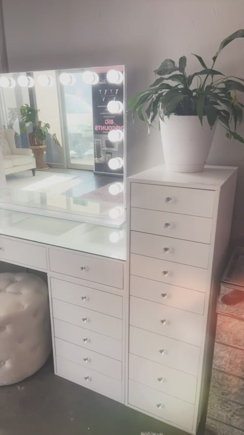Elevate your beauty routine with our Makeup Vanity Desk with Mirror, thoughtfully designed to blend elegance, functionality, and organization. Featuring 11 bright LED lights, the large mirror provides even, shadow-free illumination for flawless makeup application every time. The vanity includes 7 spacious storage drawers, offering ample room to neatly organize cosmetics, skincare, jewelry, and accessories, keeping your space clutter-free. Crafted with a modern, stylish design, this vanity desk not only enhances your daily routine but also adds a touch of luxury to any bedroom or dressing area.