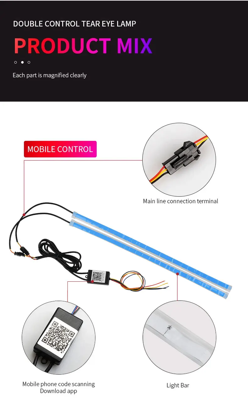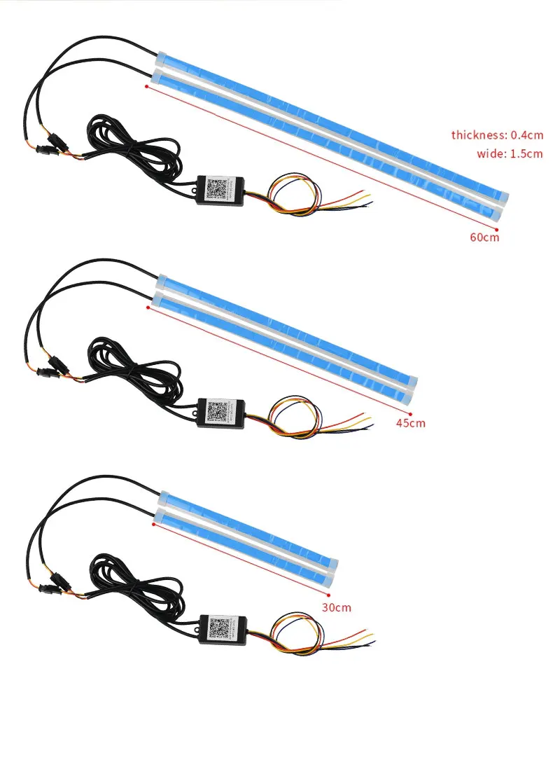 Transform your vehicle's lighting with these premium RGB daytime running lights engineered for universal 12V compatibility. This two-piece flexible LED strip system delivers dynamic illumination with app-controlled color customization, allowing you to switch between vibrant RGB modes effortlessly. The integrated turn signal functionality seamlessly coordinates with your vehicle's existing electrical system through intuitive color-coded wiring connections. Constructed from durable ABS and silicone materials, these 2835 SMD LEDs provide reliable performance across multiple length options—30cm, 45cm, or 60cm—to suit various headlight configurations. The flowing LED technology creates a sophisticated aesthetic while enhancing visibility and safety. Perfect for drivers seeking both functional daytime running capability and personalized lighting control, these strips offer professional-grade illumination with user-friendly app management. Installation is straightforward with clearly marked positive, negative, and turn signal wire connections for any universal 12V vehicle application.