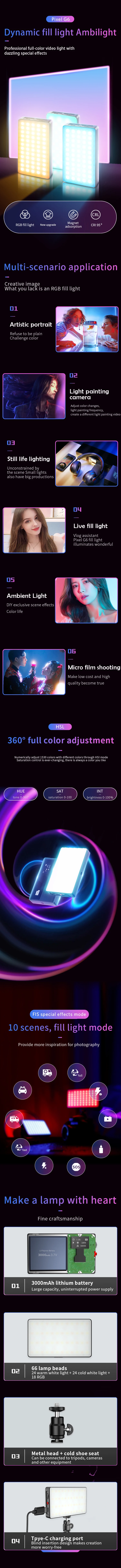 Pixel RGB Photography Video Light Ultra Slim Rechargeable LED Fill Video Lamp for YouTube Tiktok Shooting