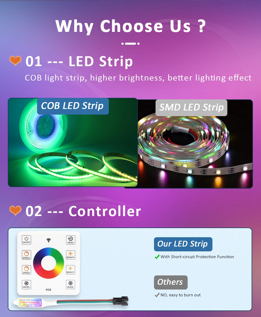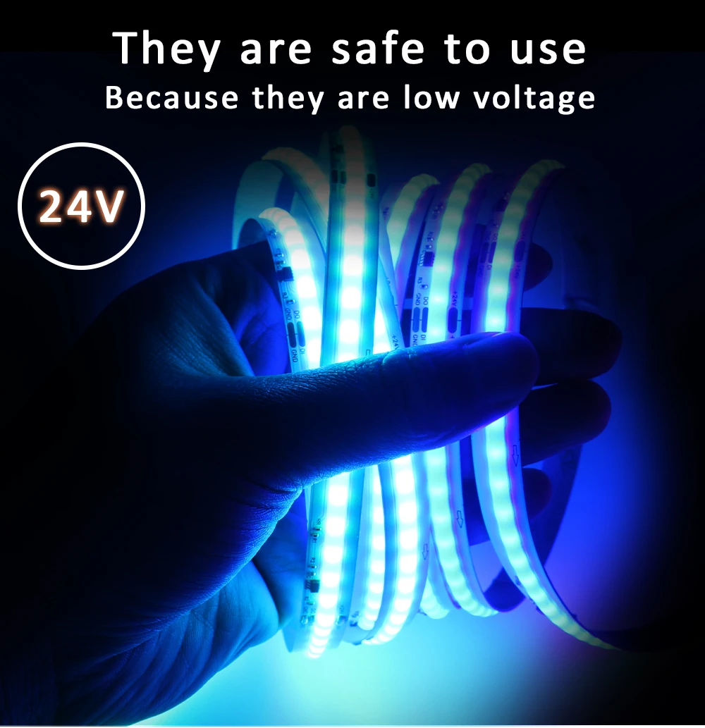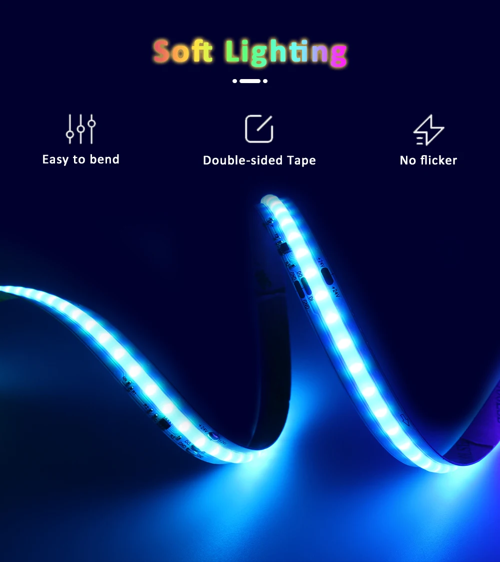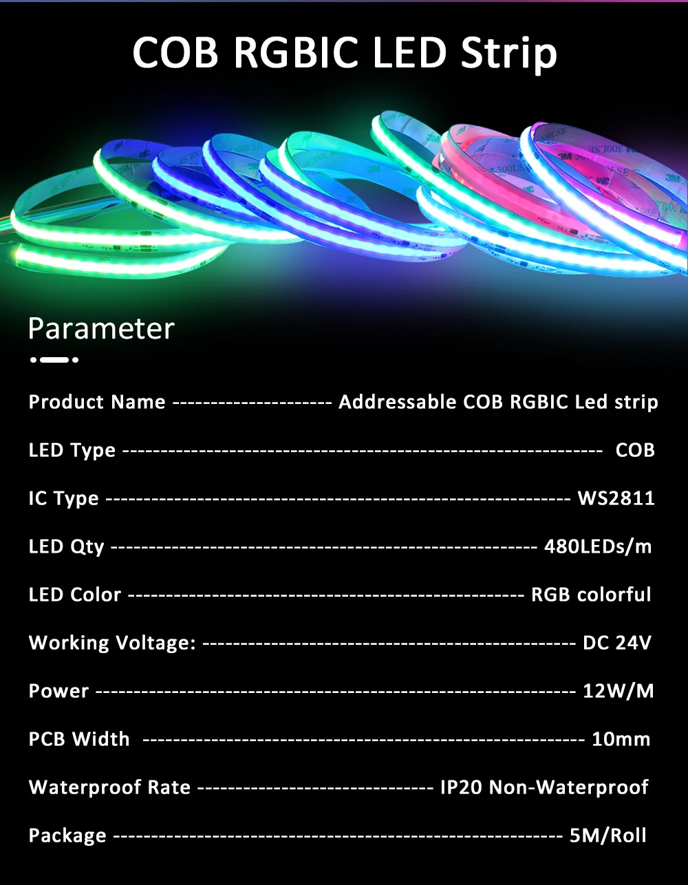 Transform your space with this premium RGBIC COB LED strip, engineered for dynamic lighting effects and reliable performance. Featuring 480 high-quality SMD3014 diodes per meter, this 24V strip delivers vibrant RGB color transitions with IC chasing effects that create mesmerizing light displays. Available in 5M, 10M, 15M, or 20M lengths to suit any room size, it's perfect for bedrooms, living spaces, and creative installations. With an impressive 50,000-hour lifespan and efficient 11.52W/m power consumption, you get long-lasting brilliance without excessive energy use. The strip is backed by multiple certifications including CE, EMC, FCC, LVD, RoHS, and UL, ensuring safety and quality. Easy to install and control, this versatile lighting solution brings professional-grade ambiance to your home décor.