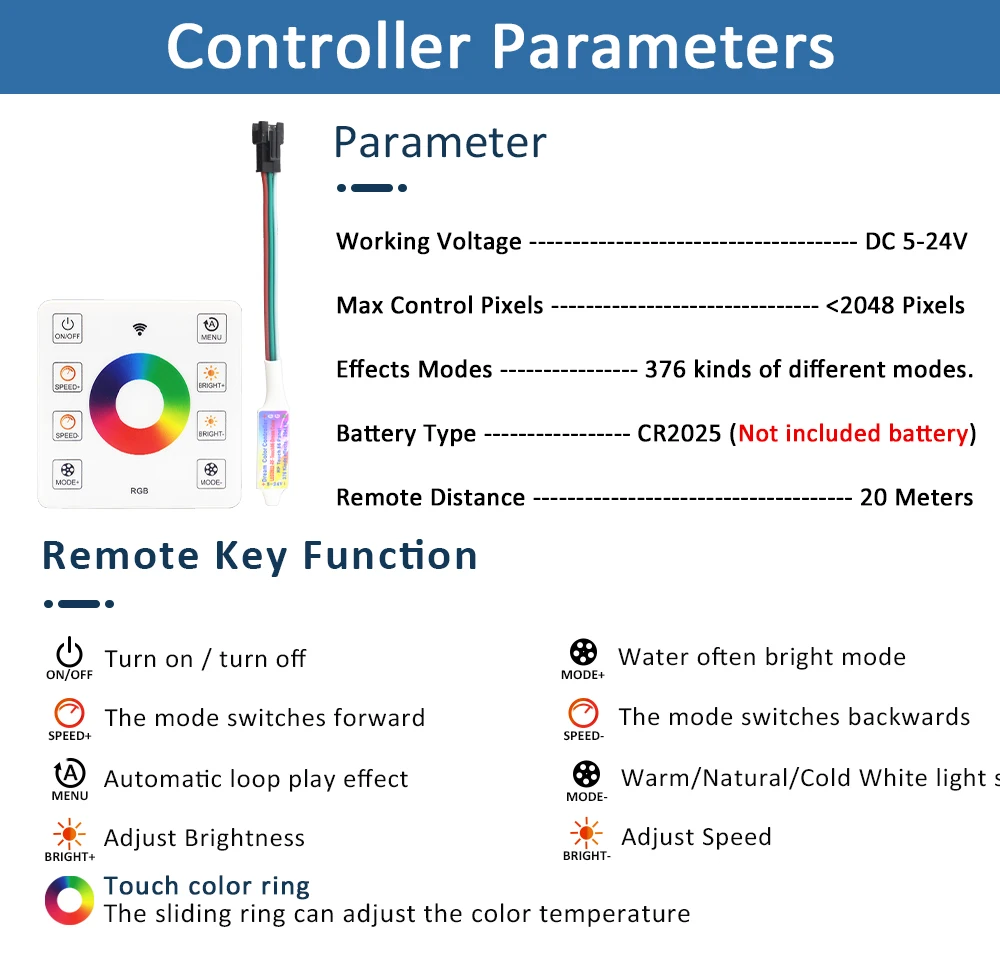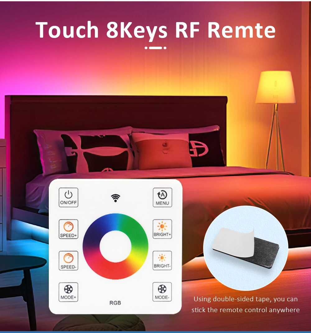 8 Keys Function: ON/OFF , Speed UP/Down, Mode+/Mode-, MENU, Brightness UP/Down, Touch color ring in the middle to adjust the static color.