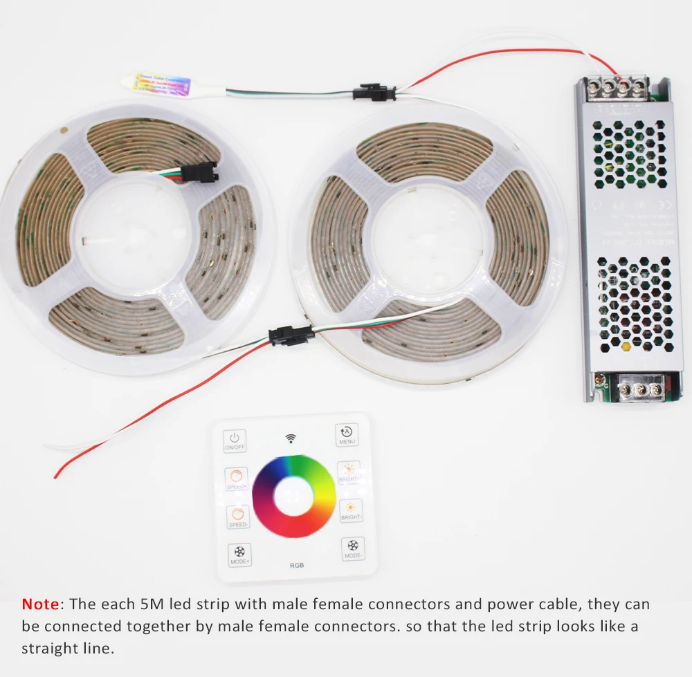 1. The each 5M led strip with male female connectors and power cable, they can be connected together by male female connectors. so that the led strip looks like a straight line.