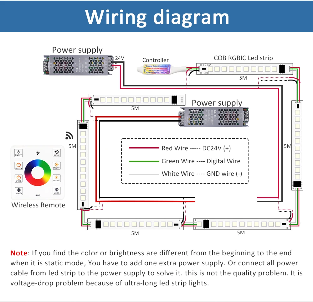 2. If you find the color or brightness are different from the beginning to the end when it is static mode, You have to add one extra power supply. Or connect all power cable from led strip to the power supply to solve it. this is not the quality problem. It is voltage-drop problem because of ultra-long led strip lights.