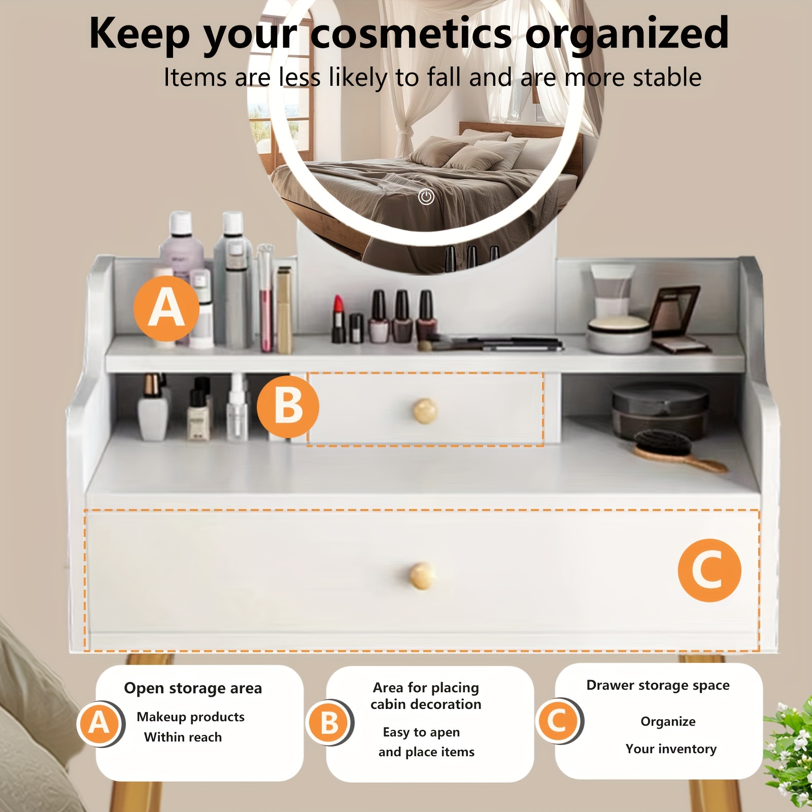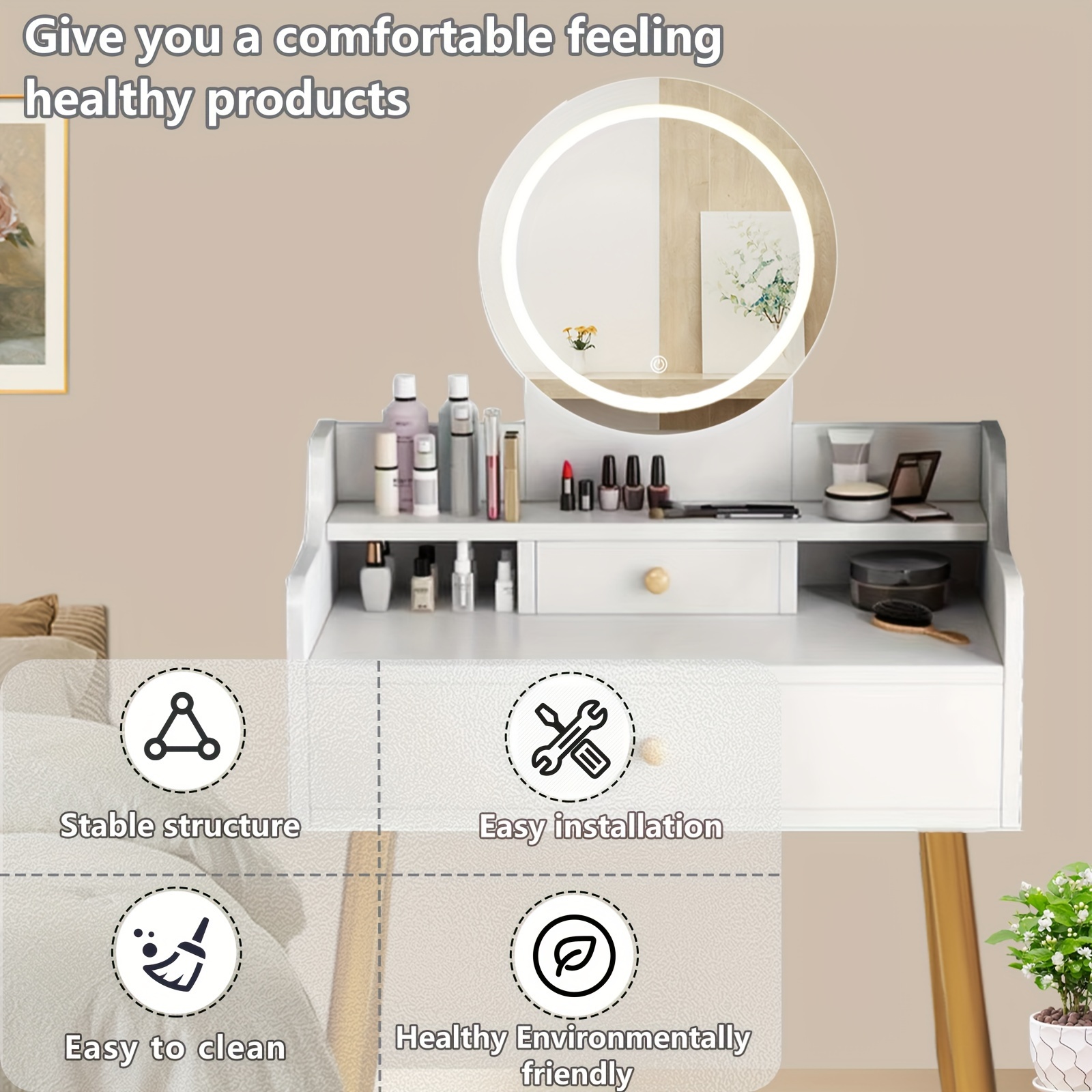 Transform your bedroom into a personal beauty sanctuary with this sophisticated vanity desk designed for modern living. Featuring integrated LED lighting with three customizable modes—bright task lighting, soft ambient glow, and energizing daylight—this piece delivers professional-grade illumination for flawless makeup application and skincare routines. The spacious mirror reflects light evenly across your face, while the thoughtfully engineered wooden construction houses generous closed storage within a compact 3.2 cubic feet capacity. Multiple drawers keep cosmetics, accessories, and personal items neatly organized and within arm's reach. Standing at a minimum of 27 inches tall, this vanity maximizes functionality without consuming excessive floor space—ideal for bedrooms, apartments, or tight quarters. Built for reliability and convenience, the unit operates on standard household voltage (110V–240V compatible) with a plug-powered design requiring no additional installation. Weighing approximately 30 pounds, assembly is straightforward, and the sturdy wooden frame ensures lasting